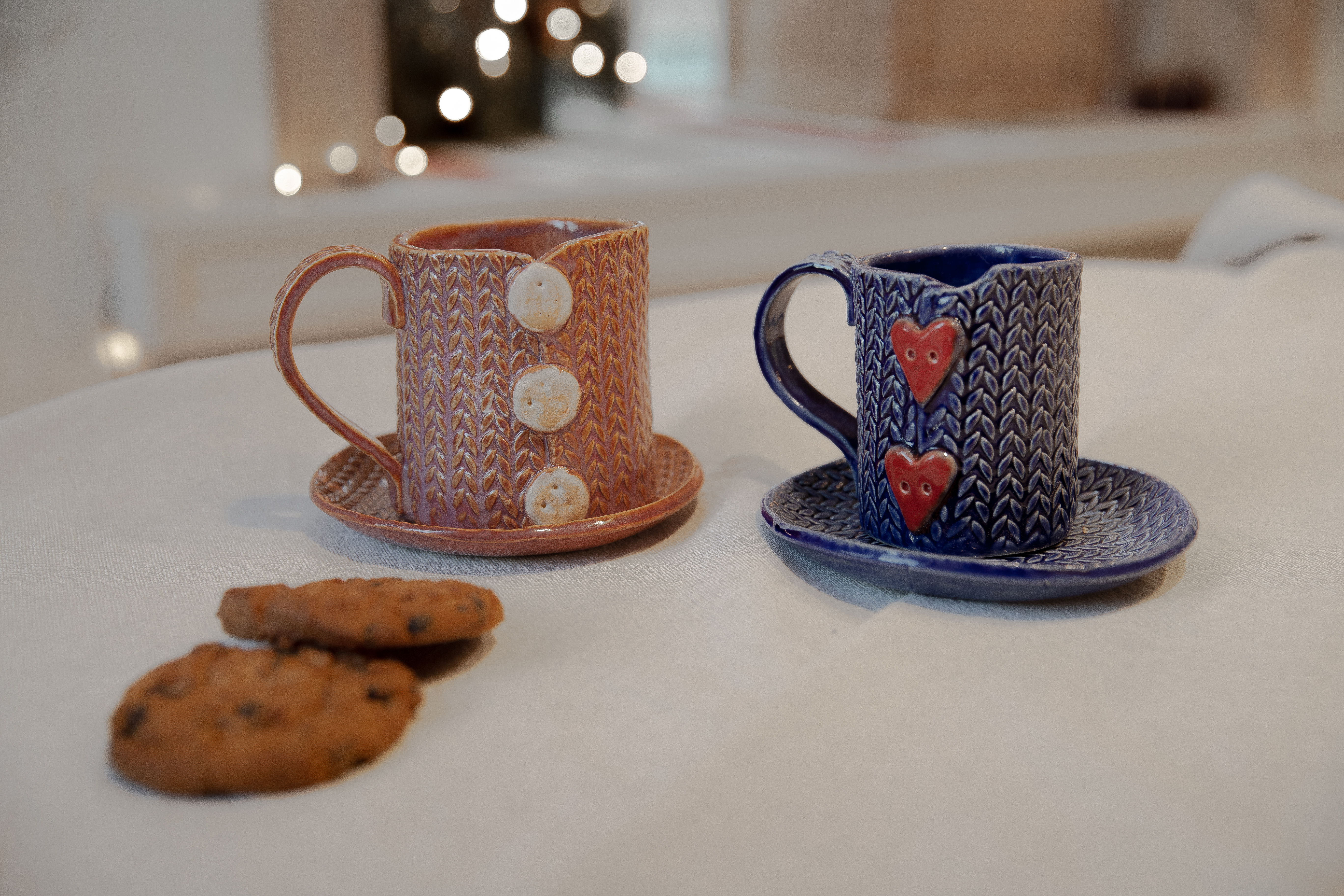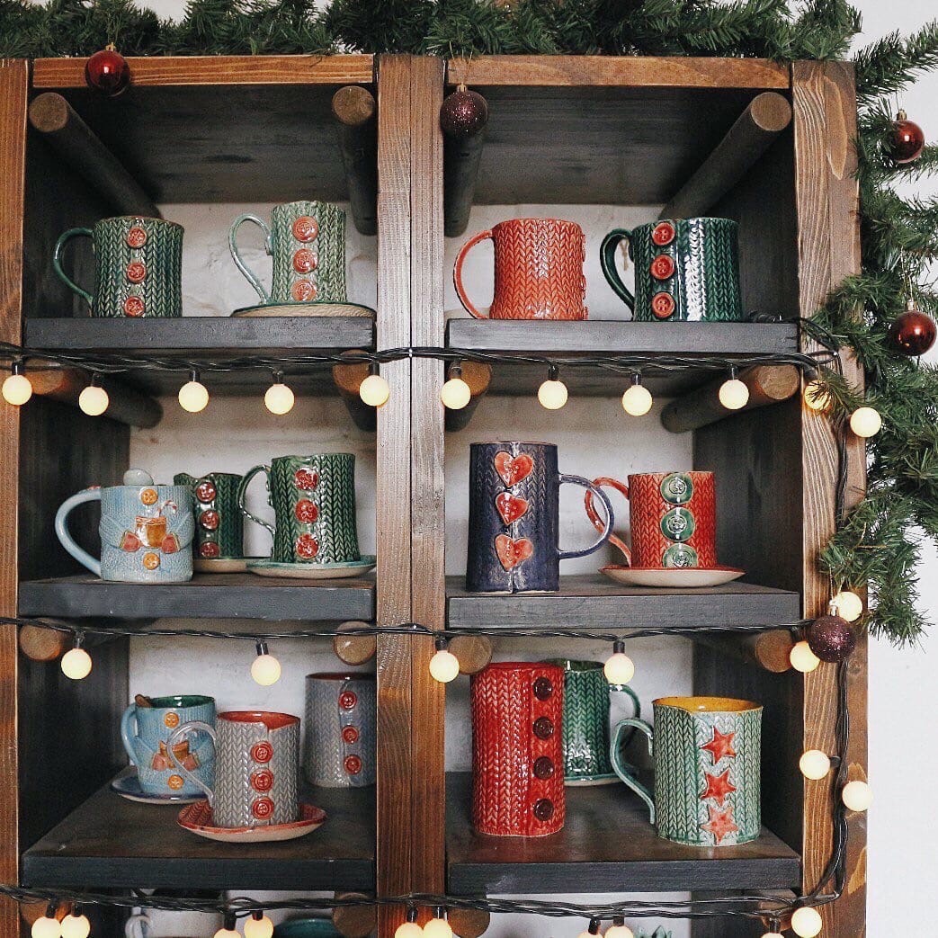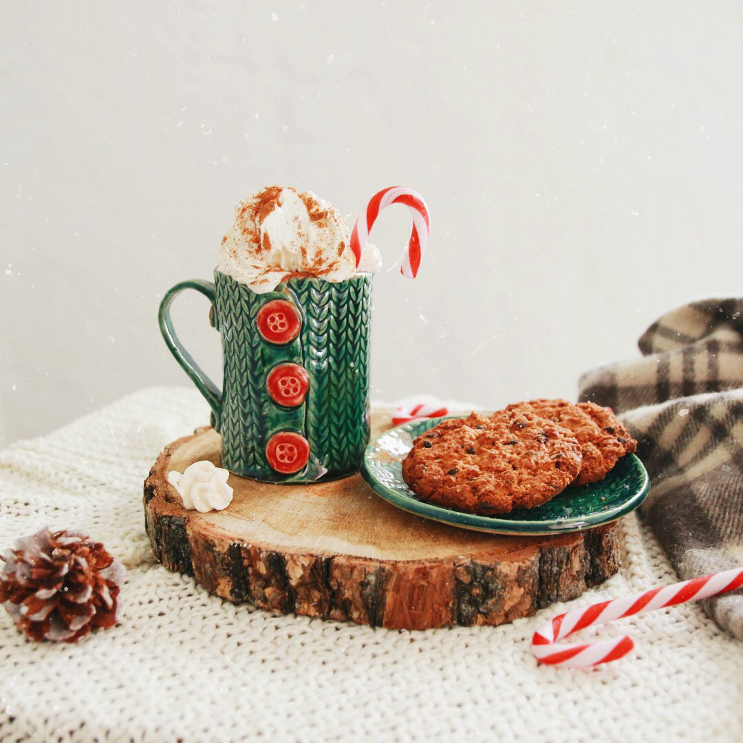 Наши самые теплые кружки - можно даже на пуговку застегнуть. Когда мы первый раз использовали текстурную скалку с узором вязаных косичек, то поняли - это будет надолго и очень по любви. Вязаные кружечки окончательно покорили наши сердца, почему?